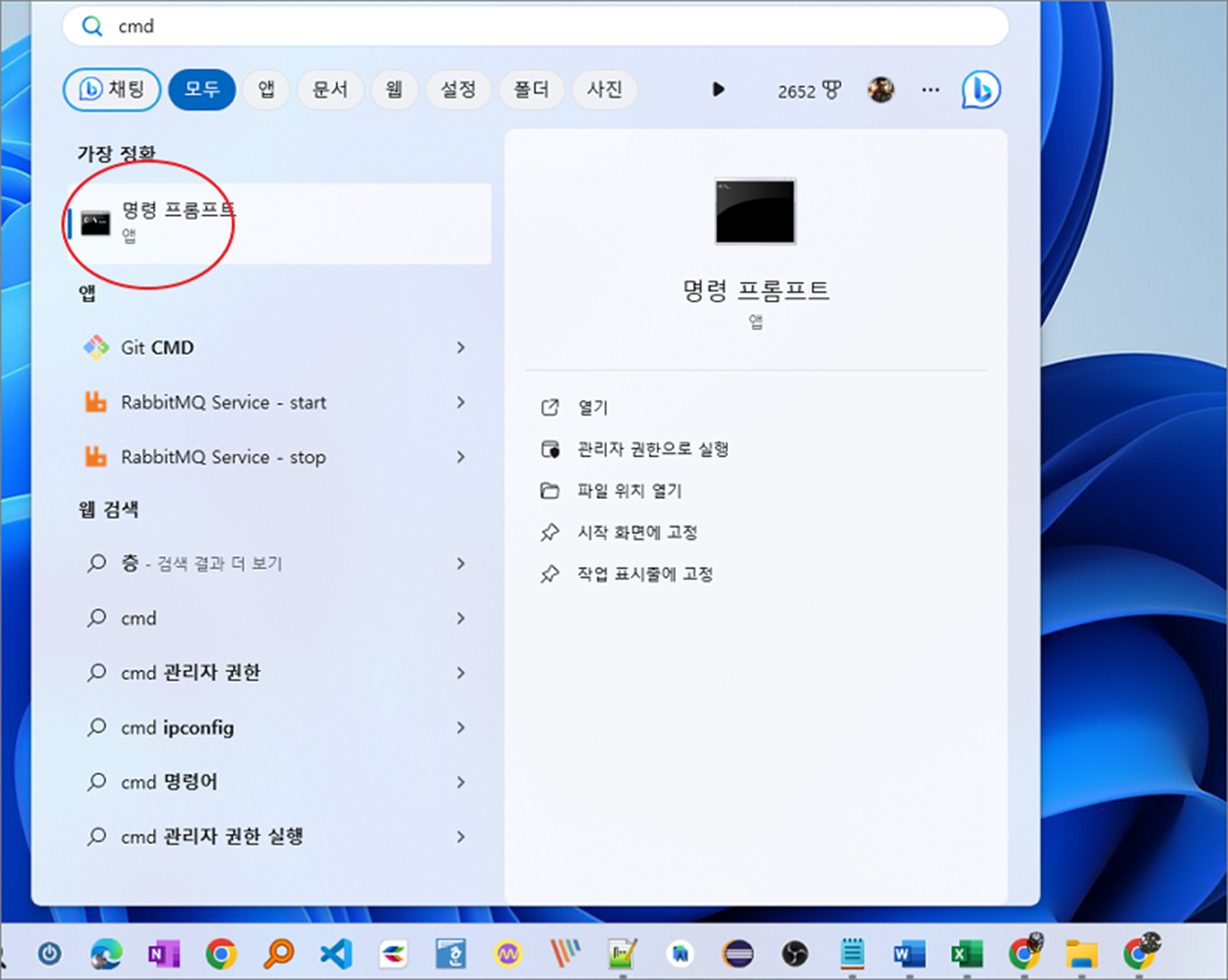 ▼ 두 번째는 명령 프롬프트에서 명령어를 이용한 방법입니다. 검색에서 명령 프롬프트를 실행합니다.