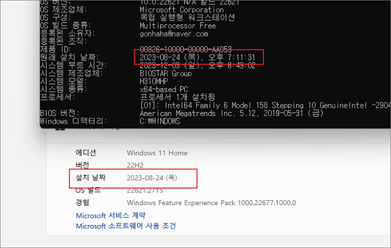 ▼ 설정화면의 날짜와 동일한 것을 알수 있습니다. 이상으로 윈도우11 설치 날짜를 확인하는 방법을 알아보았습니다.