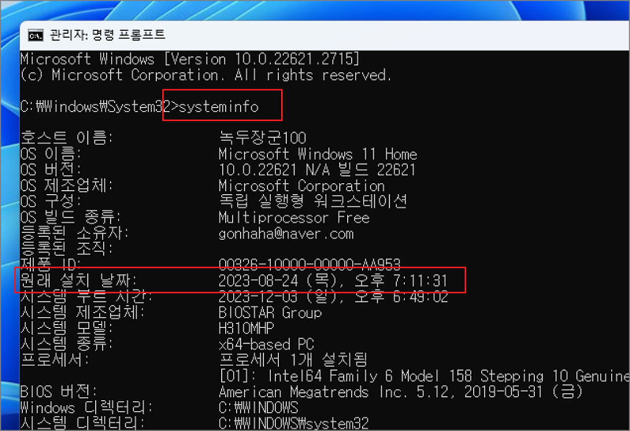 ▼ 명령 프롬프트 창이 뜨면 명령어로 systeminfo 라고 입력합니다. 화면에 나타난 정보에서 원래 설치 날짜 항목을 찾습니다.