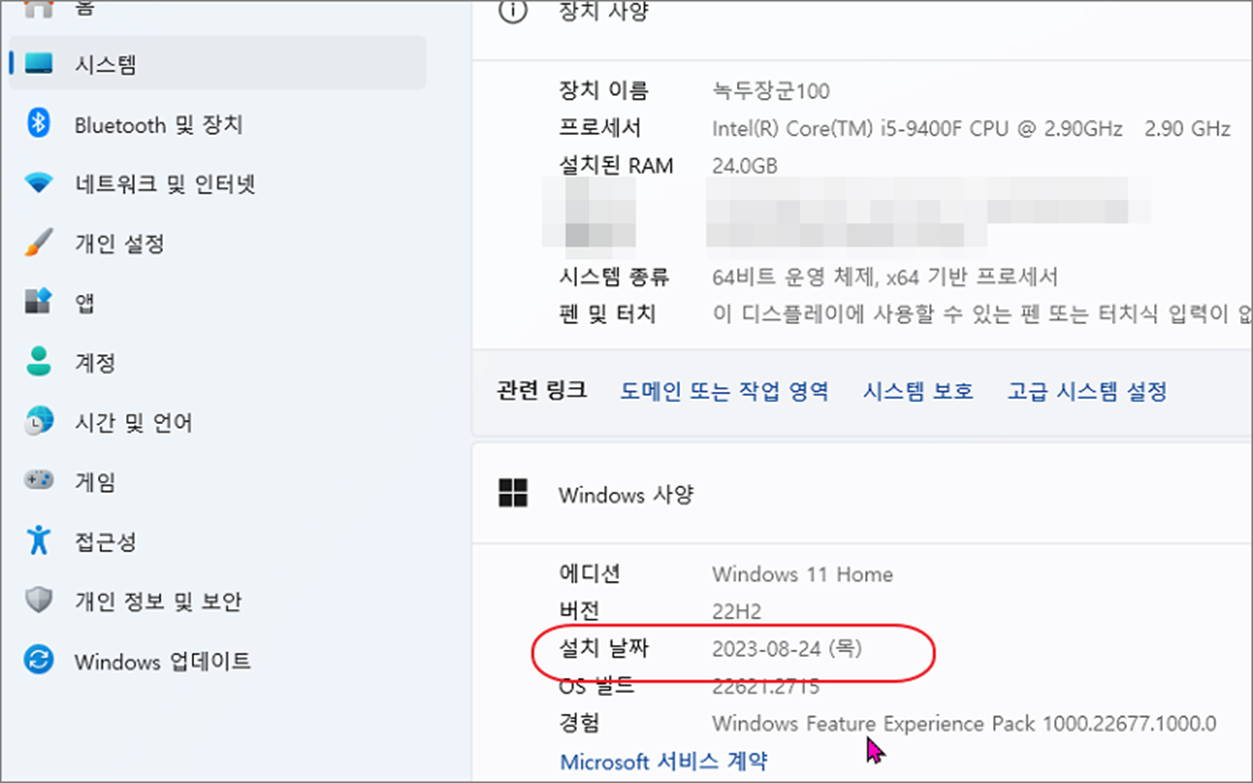 ▼ 정보 상세 화면으로 들어가시면 "윈도우 사양" 에 "설치 날짜" 를 볼 수 있습니다. 해당 날짜는 윈도우 설치날짜 라기보다 윈도우10 에서 윈도우11 로 업그레이드된 날짜입니다. 그리고 특정한 버전이 업데이트되면 해당 날짜도 동일하게 바뀝니다. 그러니까 윈도우에 문제가 생기면 어떤 버전 이후로 발생했는지 판단하는 근거가 됩니다.