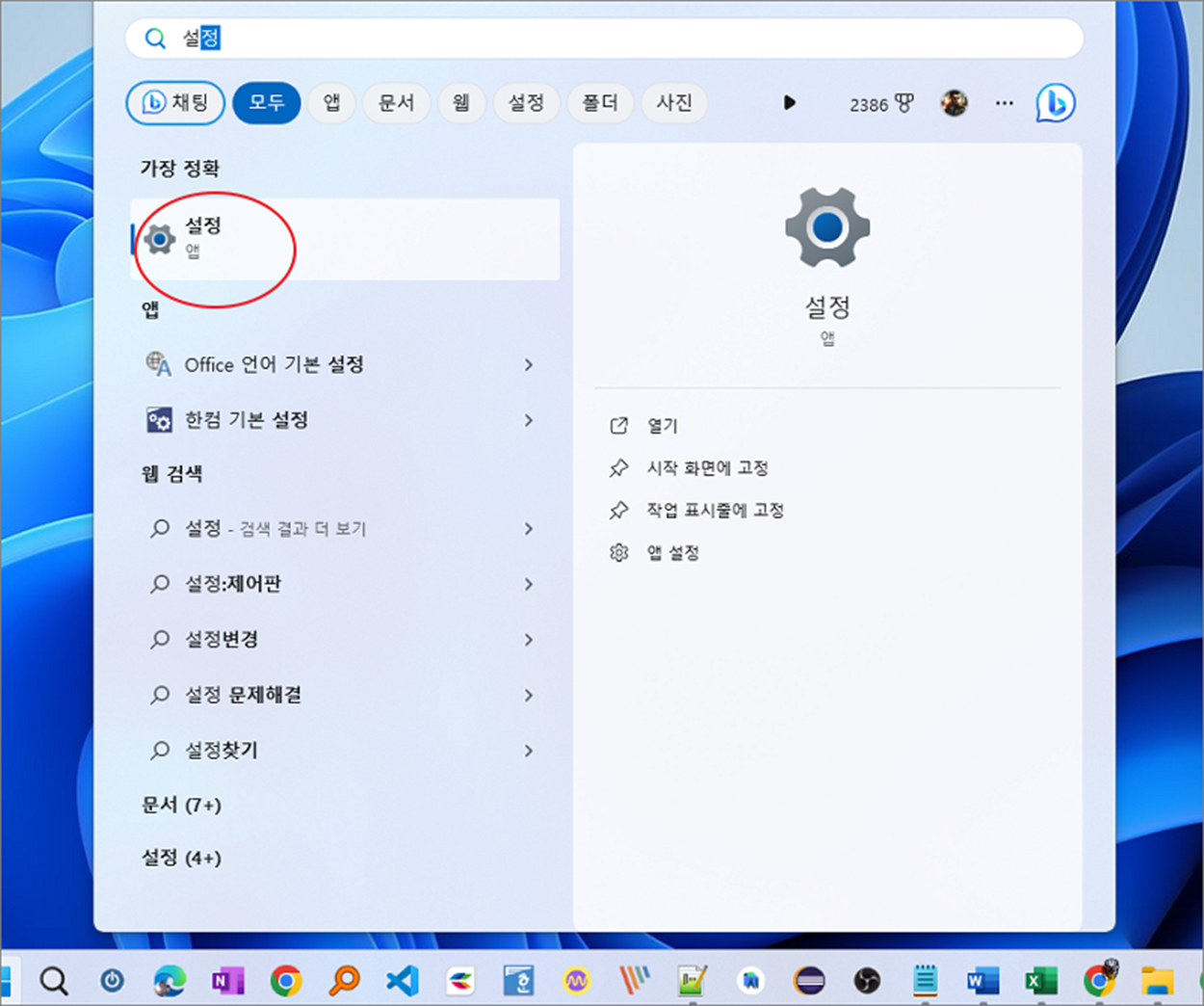 ▼ 윈도우를 처음 설치한 날짜를 확인하는 두 가지 간단한 방법을 알아보겠습니다. 먼저 설정 화면에서 확인하는 방법입니다. 검색에서 설정 창을 띄웁니다.