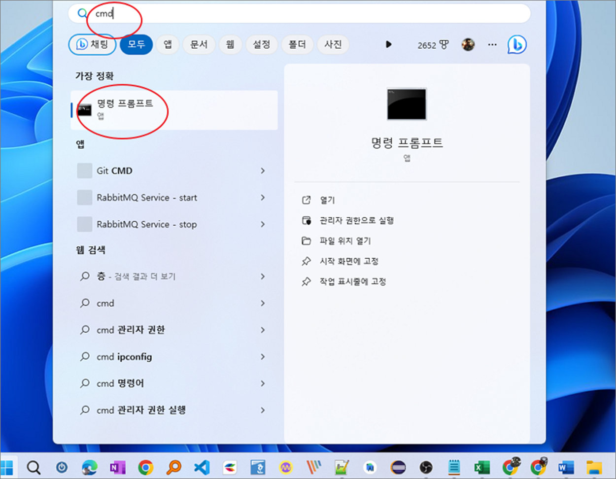 ▼ 첫 번째는 명령 프롬프트를 이용해 ipconfig 명령어로 조회하는 방법입니다. 검색에서 명령 프롬프트를 찾아 실행합니다. 아이피 주소를 확인할 때는 관리자 권한으로 띄우지 않아도 됩니다.