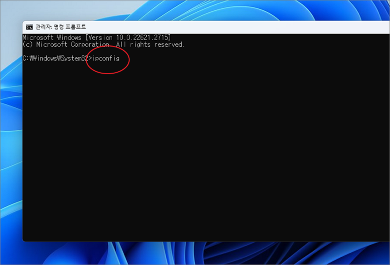 ▼ 명령 프롬프트 창을 띄웠다면 커서가 깜빡이는 곳에 ipconfig 라고 키보드로 입력하고 나서 엔터를 눌러 실행합니다.