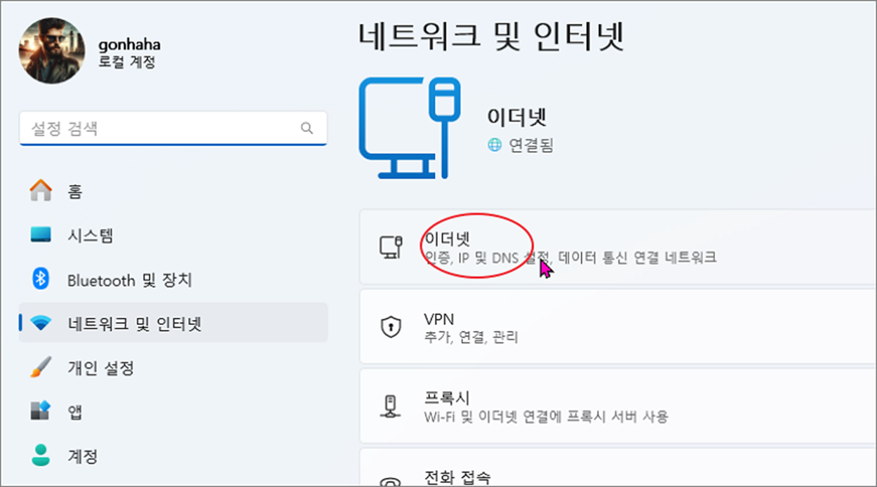 ▼ 다음 해당 설정 페이지로 이동해서 오른쪽 상단에 "이더넷" 메뉴를 선택합니다.