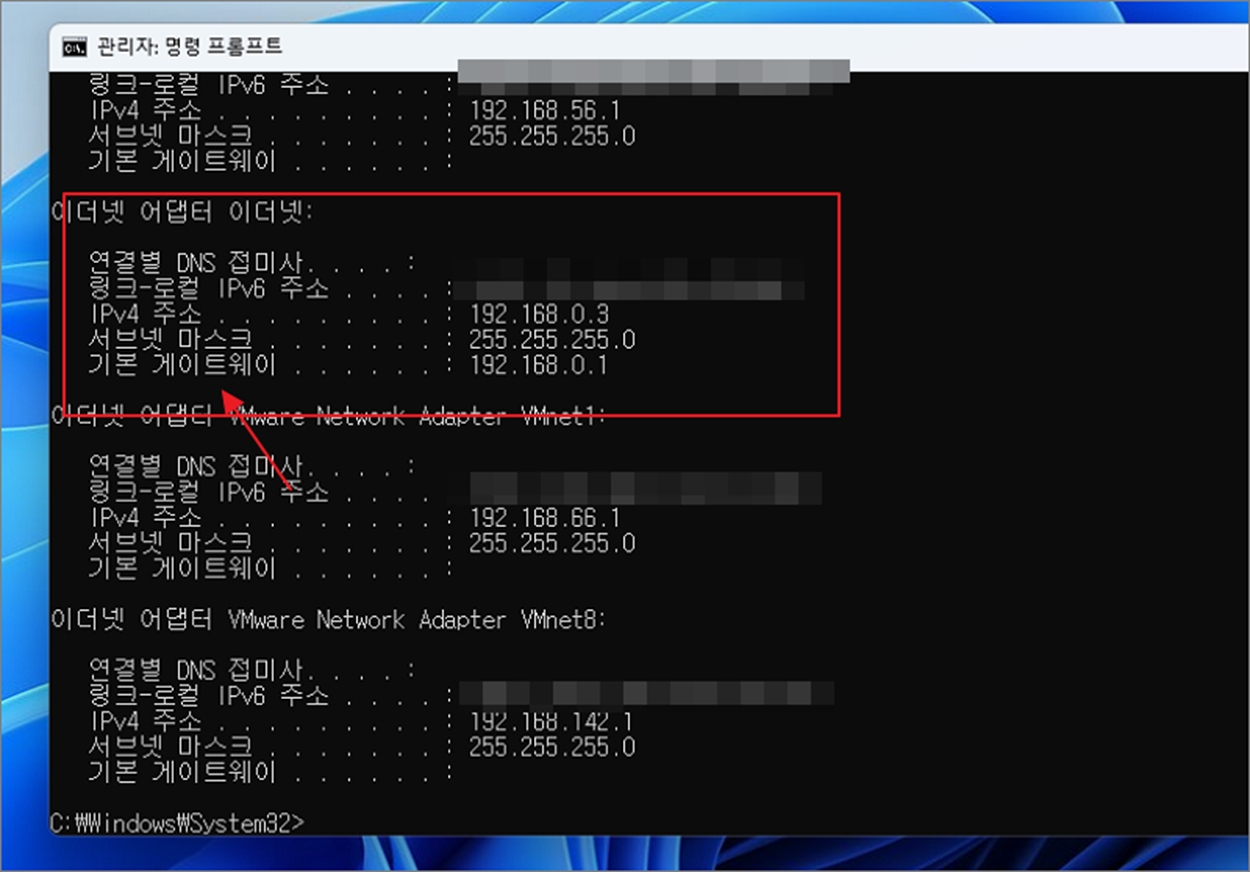 ▼ 화면에 실행 결과가 나오면 자신의 PC 에 설정된 아이피를 찾아야 합니다. 여러 이더넷 어댑터 중에서 "이더넷 어댑터 이더넷" 항목의 "기본 게이트웨이" 정보가 있는 곳의 아이피 주소가 우리가 찾는 정보입니다. 다른 이더넷 어댑터를 보시면 "기본 게이트웨이" 정보가 없을 겁니다. 제 PC에 할당 받은 아이피 주소는 192.168.0.3 인 것을 확인할 수 있습니다.