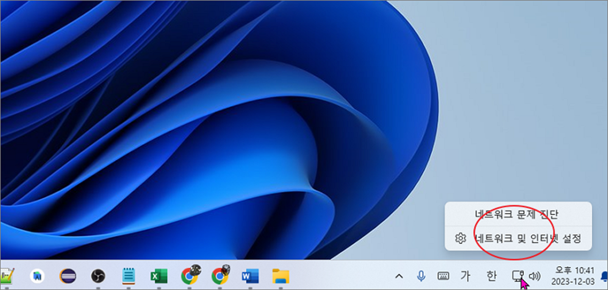 ▼ 두 번째는 네트워크 어댑터 설정창에서 확인하는 방법입니다. 설정창을 빠르게 이동하기 위해 작업 표시줄에서 오른쪽 끝에 있는 네트워크 아이콘으로 갑니다. 그리고 오른쪽 마우스를 클릭하고 하위 메뉴에서 "네트워크 및 인터넷 설정" 메뉴를 선택합니다.