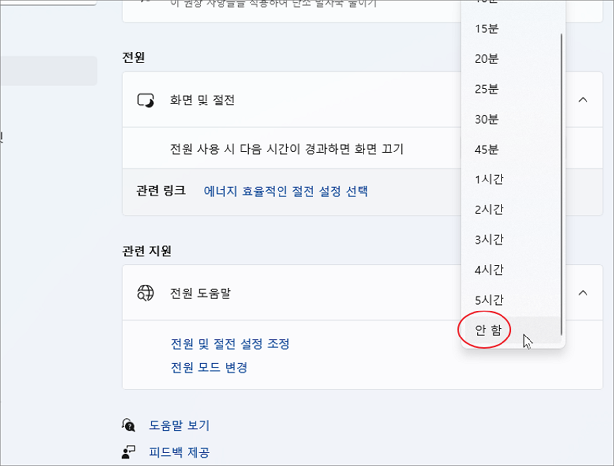 ▼ 다음은 화면이 아예 꺼지지 않도록 설정해 볼까요? 방금 시간 설정을 한 목록으로 갑니다. 그리고 제일 아래로 내려가시면 "안 함" 이라고 있습니다. 이 옵션이 화면이 꺼지지 않는 옵션입니다. 창을 닫으면 설정이 끝납니다. 이상으로 윈도우11 에서 화면 보호기 화면 꺼짐 시간을 조절하거나 꺼지지 않도록 설정을 변경하는 방법을 알아보았습니다.