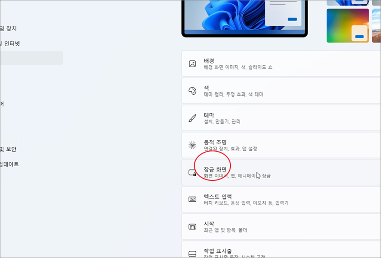 ▼ 개인 설정 화면으로 오면 오른쪽 화면으로 이동한 후 "잠금 화면" 을 찾아 클릭해 주세요.