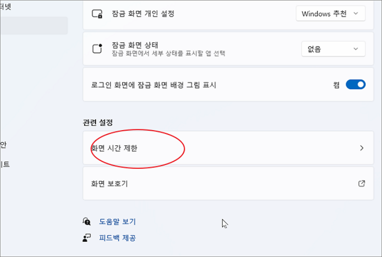 ▼ "잠금 화면" 으로 이동하면 오른쪽 화면에서 "관련 설정" 항목으로 이동합니다. 이곳에는 "화면 시간 제한" 이라는 메뉴가 있습니다. "화면 시간 제한" 을 클릭해서 상세 전환 설정 화면으로 이동합니다.