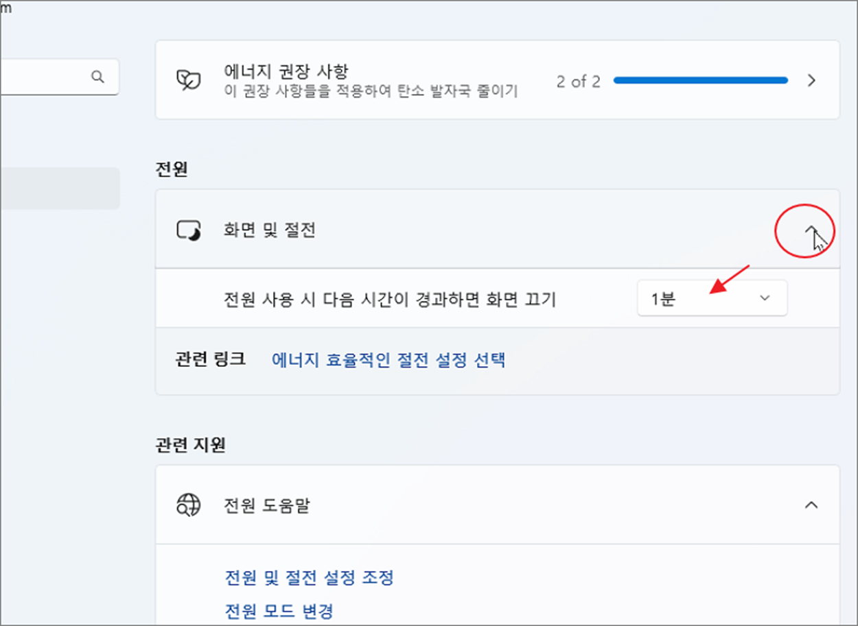 ▼ "전원" 설정 화면에서 "화면 및 절전" 메뉴를 클릭해 보세요. 화면 아래에 "전원 사용 시 다음 시간이 경과하면 화면끄기"라는 옵션이 하나 나타날 겁니다. 보통 기본은 1분입니다. 시간은 콤보박스를 클릭해서 늘일 수 있습니다. 원하는 시간을 선택해서 화면 꺼짐 시간을 맞춥니다. 전원 꺼짐 시간이 짧으면 상단 에너지 권장 사항이 권장으로 바뀝니다.