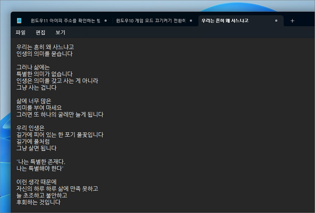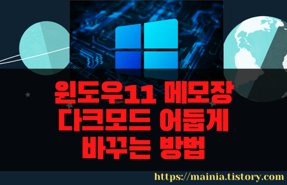 윈도우 프로그램에서 다크모드는 눈의 피로를 감소시킬 뿐만 아니라 노트북인 경우 배터리 사용량도 줄일 수 있습니다. 그리고 집중력도 향상시키기 때문에 모든 프로그램에는 기본적으로 다크모드 옵션을 제공합니다. 윈도우11 자체의 다크모드도 가능한데, 오늘은 윈도우에서 자주 사용하는 내장 프로그램인 메모장을 다크모드로 전환하는 방법을 알려드리겠습니다.