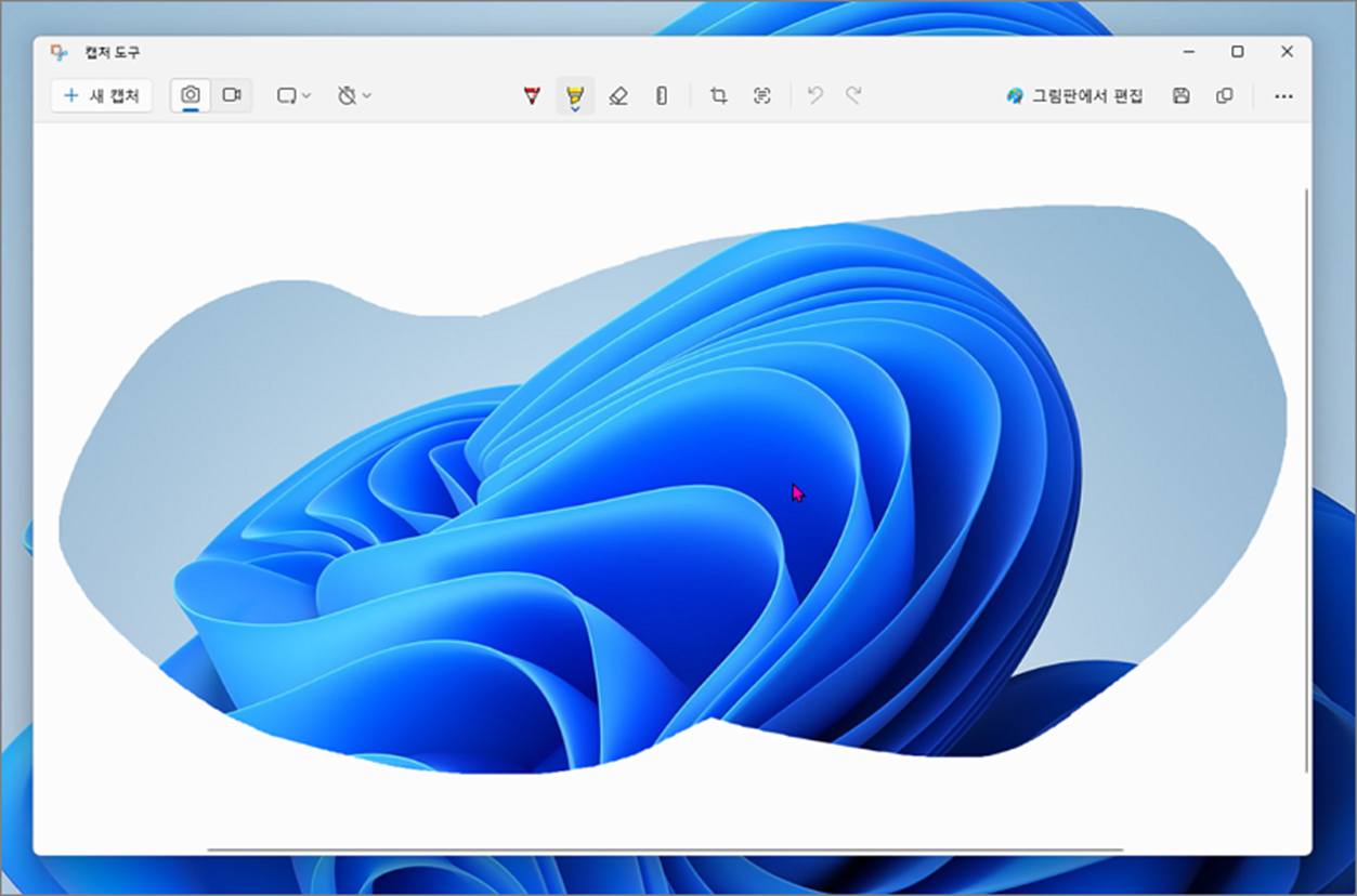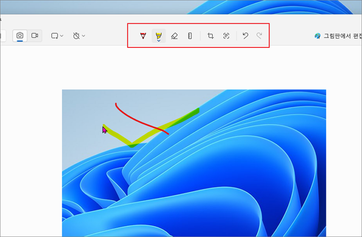 ▼ 캡처 도구에는 캡처한 이미지를 편집할 수 있는 간단한 도구들도 제공합니다. 형광펜, 지우개, 이미지 자르기 등을 제공합니다.