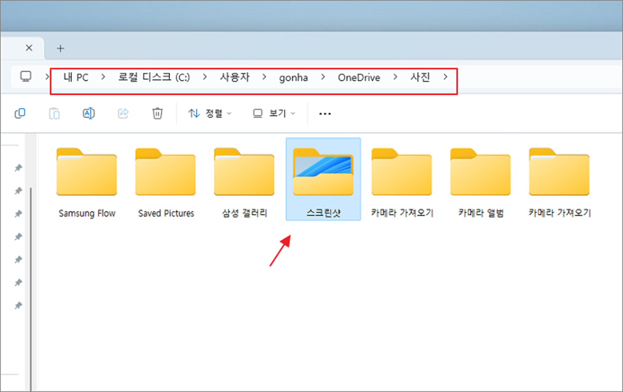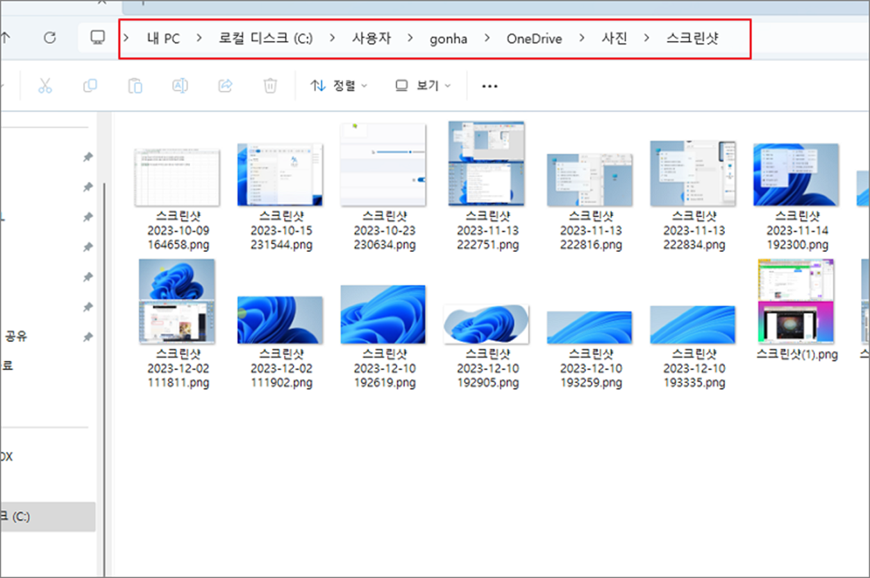 ▼ 그리고 "사진" 에 "스크린샷" 폴더로 들어가시면 지금까지 캡처 도구로 저장한 이미지 전체를 볼 수 있습니다. 만약 온드라이브 연결이 안되어 있다면 로그인한 계정명 폴더에서 사진 아래 스크린샷 폴더를 찾습니다. 이상으로 윈도우11 스크린샷 유틸리티를 이용하는 방법에 대해 알아보았습니다.