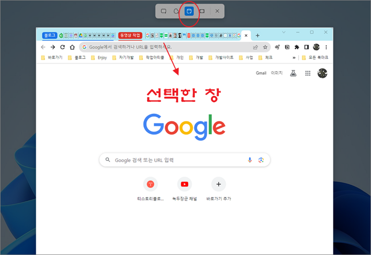 ▼ 다음은 "창 모드"를 알아보겠습니다. 창모드는 현재 선택한 창의 캡처를 시도합니다. 창모드에서 브라우저나 탐색기등 프로그램 선택하면 선택한 프로그램 내부를 캡처합니다.