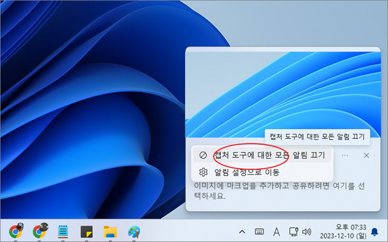 ▼ 매번 울리는 알림이 번거롭다면 해당 알림을 끄는 것도 가능합니다. 더보기에서 "캡처 도구에 대한 모든 알림 끄기" 메뉴를 클릭합니다. 알림 화면을 클릭해서 캡처 도구를 띄우서 파일을 저장할 수도 있습니다.