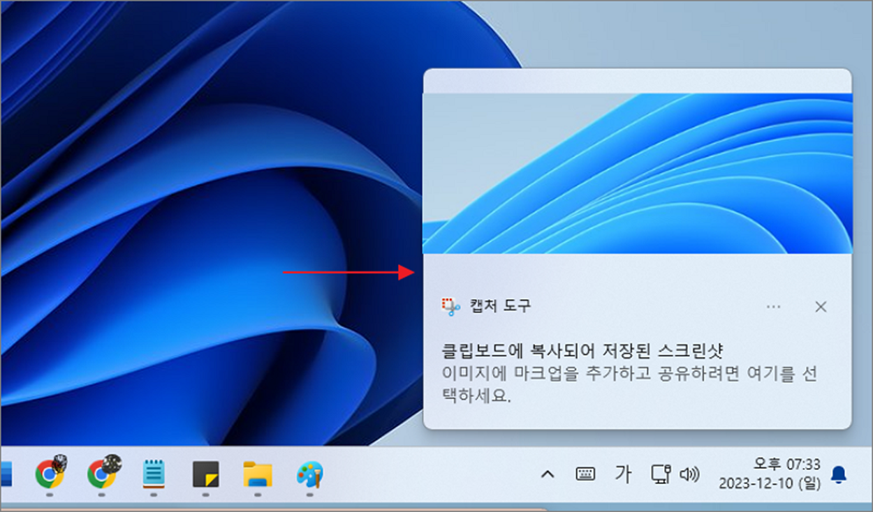 ▼ 상단에 캡처 도구 바가 뜰 겁니다. 캡처를 진행하면 오른쪽 하단에 알림이 뜹니다. 이전과 달리 캡처 도구 앱을 실행하지 않았기 때문에 알림을 통해서 프로그램을 띄우는 것입니다.