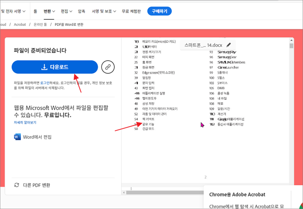 ▼ 업로드와 함께 변환이 완료되면 화면에는 파일을 다운받을 수 있는 버튼과 변환 결과를 오른쪽 화면에 보여줍니다. 변환한 워드 파일을 다운받습니다.