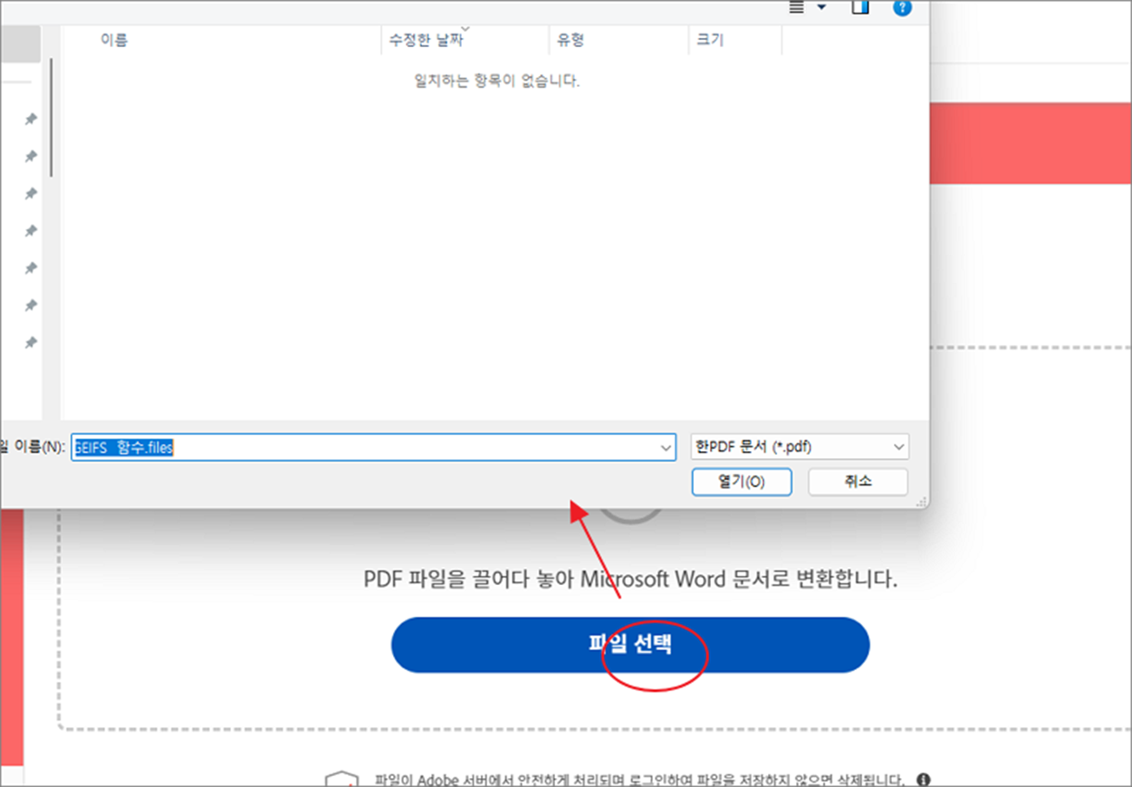 ▼ 그럼 상단에 어도비 (Adobe) 사에서 제공하는 링크가 나타날 겁니다. 해당 웹 페이지로 접속하시면 화면 중앙에 피디에프(PDF) 를 워드로 변환할 수 있다는 문구와 함께 파일을 올릴 수 있는 창이 나타납니다.