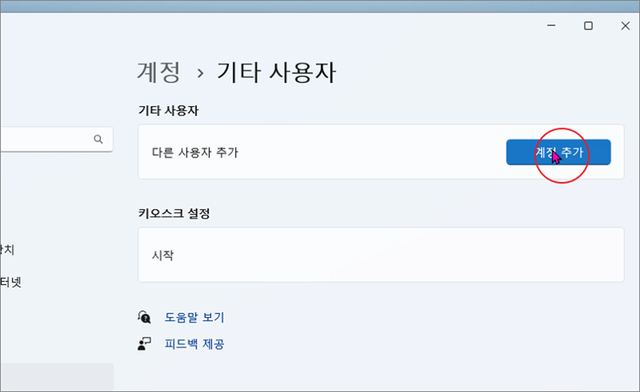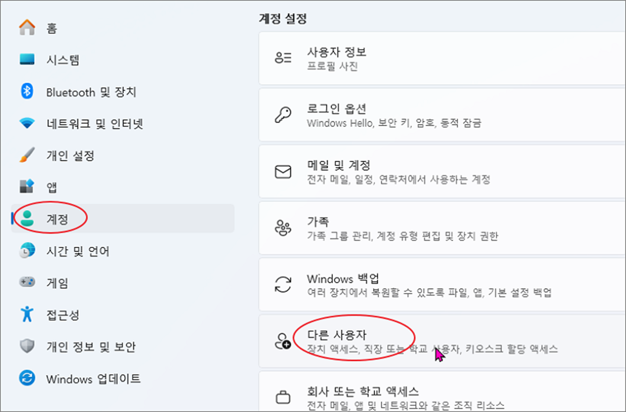▼ 우선 설정 창으로 이동합니다. 왼쪽 사이드에서 계정 메뉴를 선택하고 오른쪽에서 "다른 사용자" 메뉴를 클릭합니다.