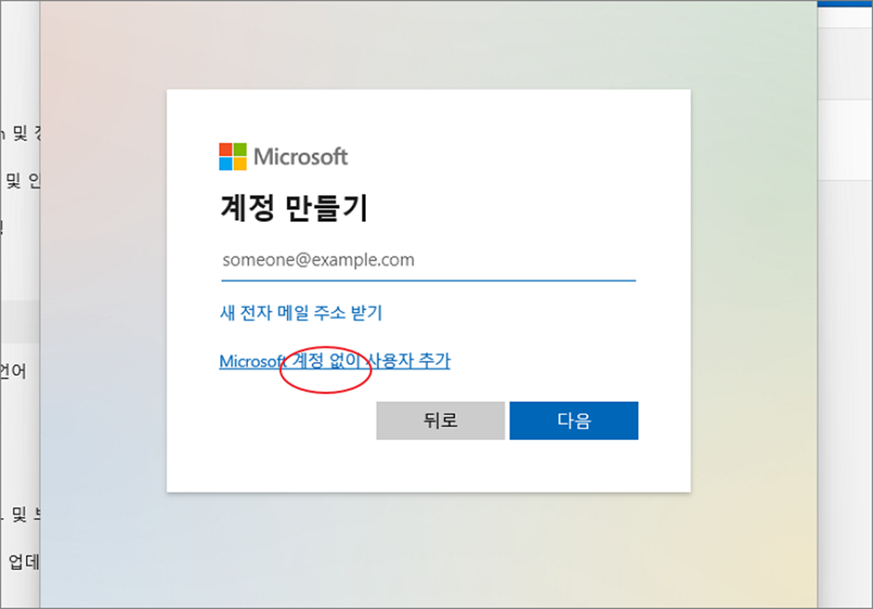 ▼ 다음 화면에서 신규로 마이크로소프트 계정을 만들지 않겠다면 제일 아래에 "마이크로소프트 계정 없이 사용자 추가" 링크를 클릭합니다.