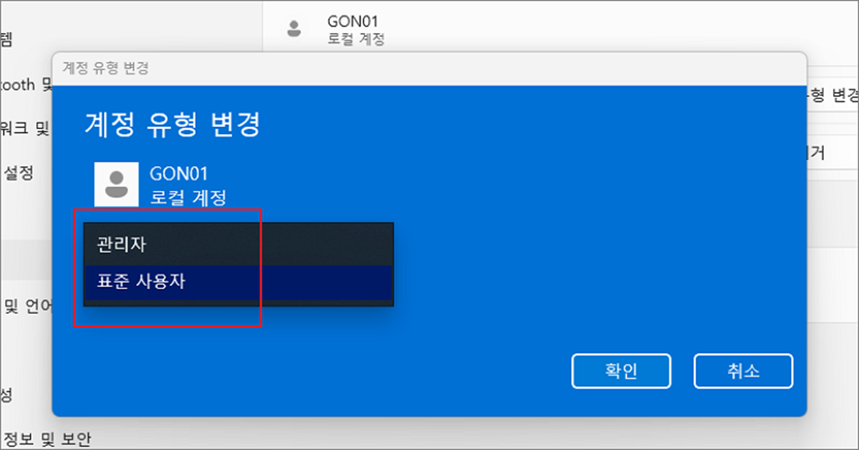 ▼ 여기에 박스를 클릭해서 "관리자" 와 "표준 사용자" 하나를 선택하고 "확인" 버튼을 눌러 창을 닫습니다.