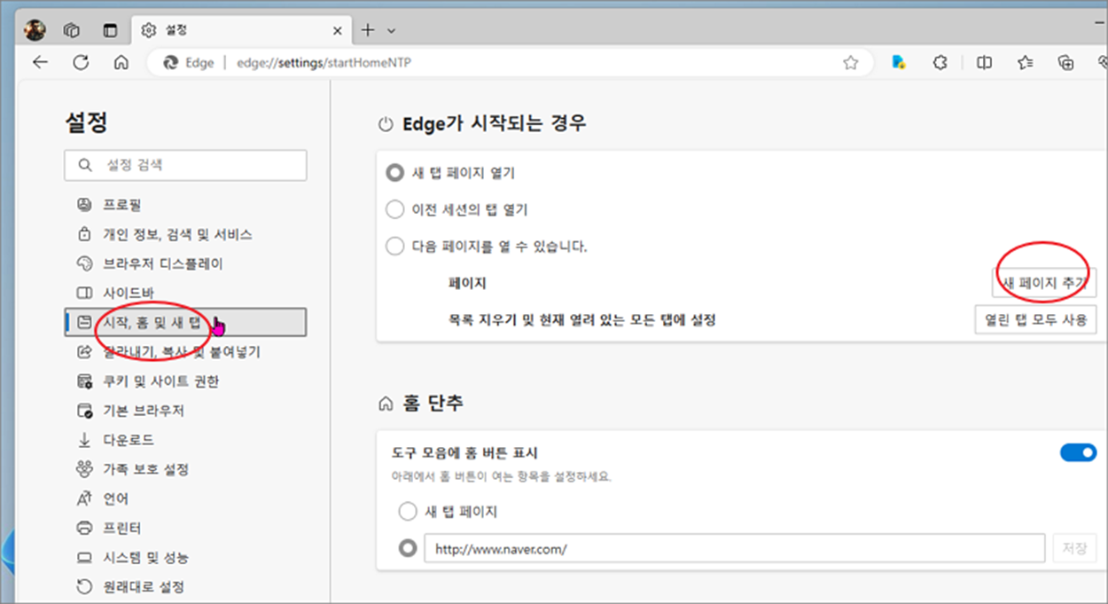 ▼ 설정 페이지로 이동했다면 왼쪽 사이드에 "시작 홈 및 새 탭" 을 선택합니다. 오른쪽 화면으로 가서 "새 페이지 추가" 버튼을 클릭하고 화면에 뜬 입력란에 자신이 시작 페이지로 표시하고 싶은 주소를 입력합니다.