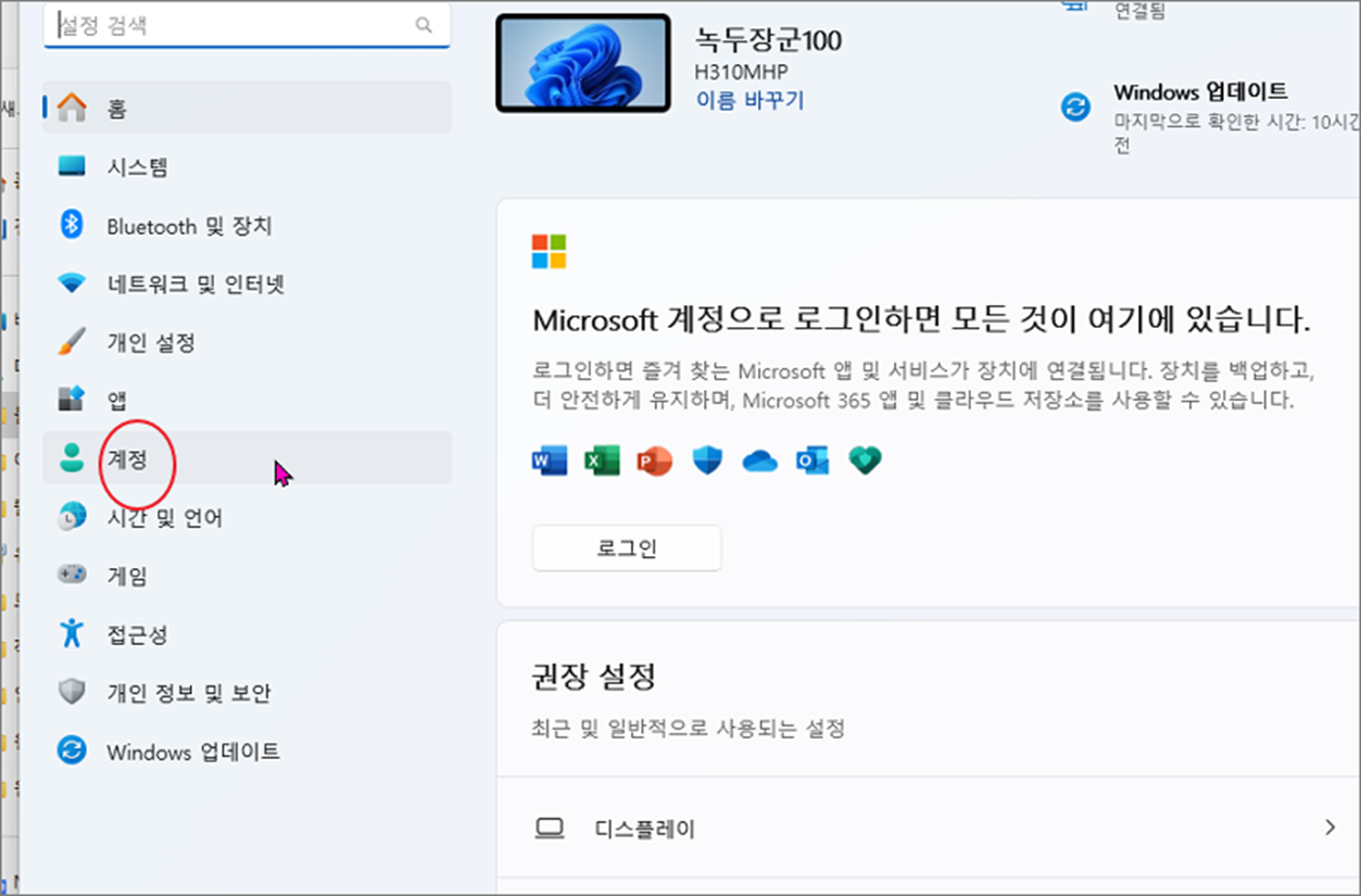 ▼ 검색을 통해 설정창을 띄웁니다. 설정에서 왼쪽 사이드에 계정 메뉴를 선택합니다.