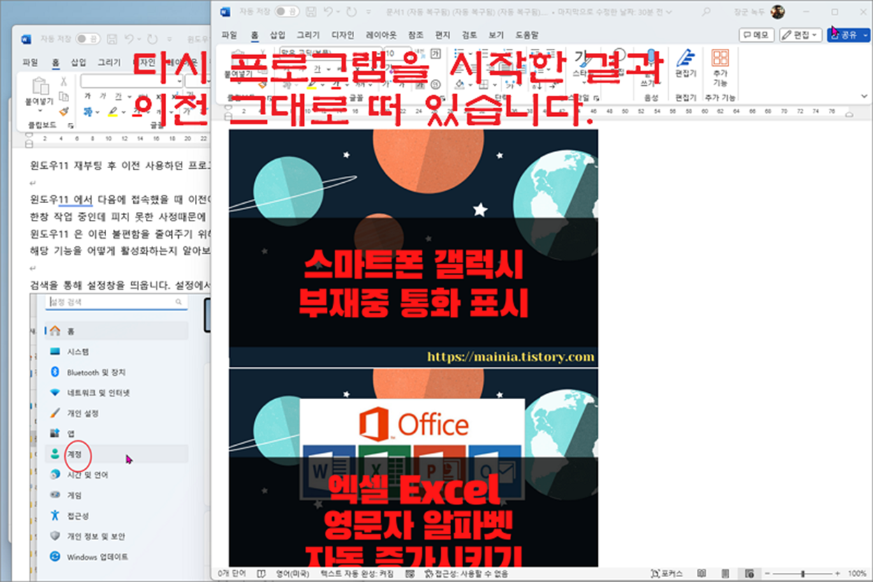 윈도우11 에서 다음에 접속했을 때 이전에 사용하던 프로그램들을 종료하지 않고 그대로 유지하는 방법이 있습니다.한창 작업 중인데 피치 못한 사정때문에 사용하던 앱들을 종료하고 컴퓨터를 끄게 된다면 작업을 이어 나갈수 없어서 불편했습니다. 윈도우11 은 이런 불편함을 줄여주기 위해 컴퓨터를 새로 켤 때마다 이전에 사용하던 앱을 자동으로 띄웁니다.해당 기능을 어떻게 활성화하는지 알아보겠습니다.