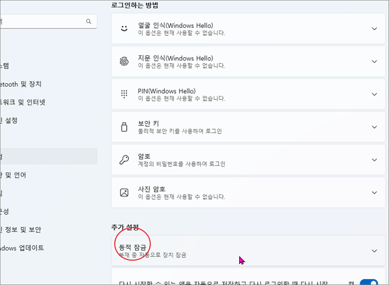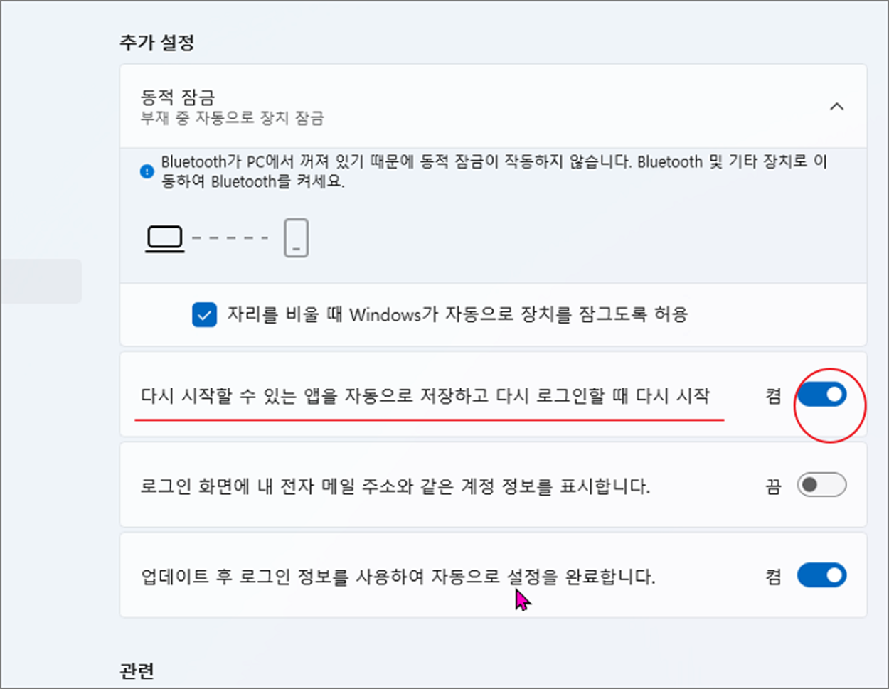 ▼ "로그인 옵션" 상세 설정 화면으로 넘어가서 "동적 잠금" 밑에 "다시 시작할 수 있는 앱을 자동으로 저장하고 다시 로그인할 떄 다시 시작" 옵션을 찾습니다.