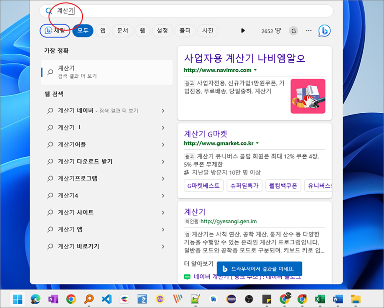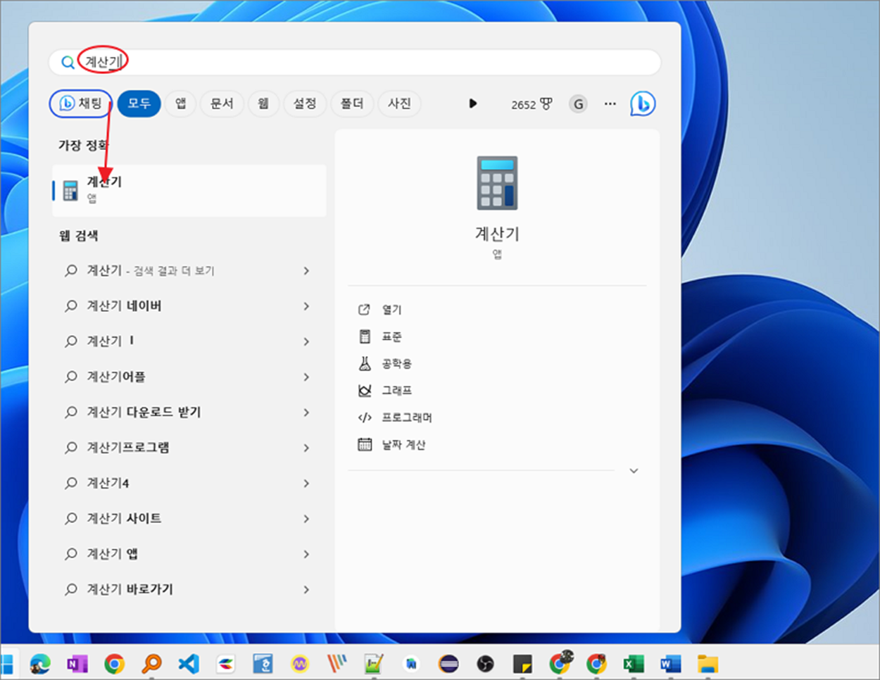 ▼ 이제 종료하고 검색창에서 계산기 앱을 실행할 수 있는지 확인해 보겠습니다. 앱을 종료하고 검색창에 "계산기" 라고 입력해 봅니다. 검색 목록에 계산기 앱이 뜨는 것을 확인할 수 있습니다. 앞으로 윈도우11에서도 윈도우10에서처럼 계산기를 사용할 수 있게 되었습니다. 이상으로 윈도우11에 계산기 앱을 설치하는 방법을 알아보았습니다.