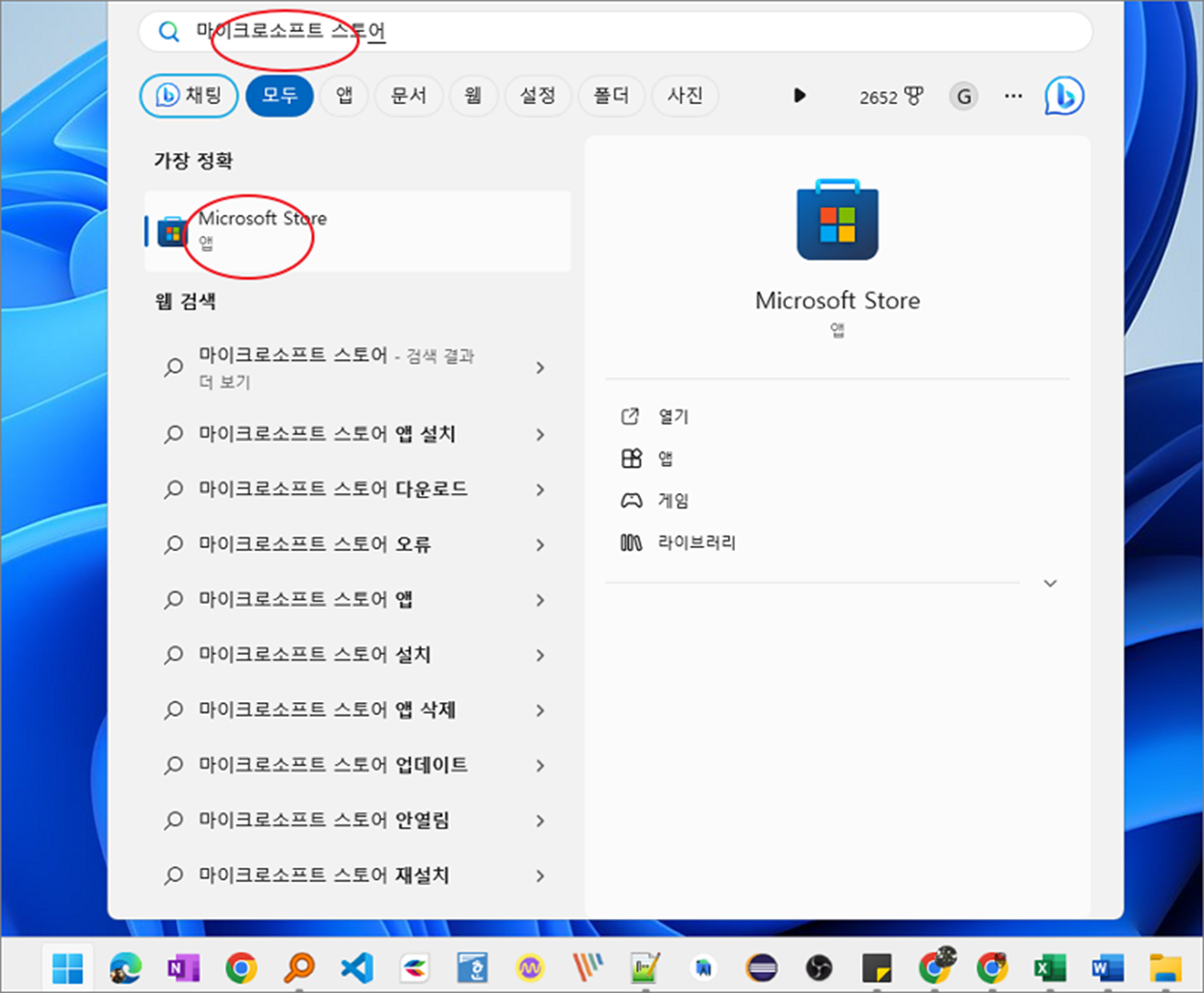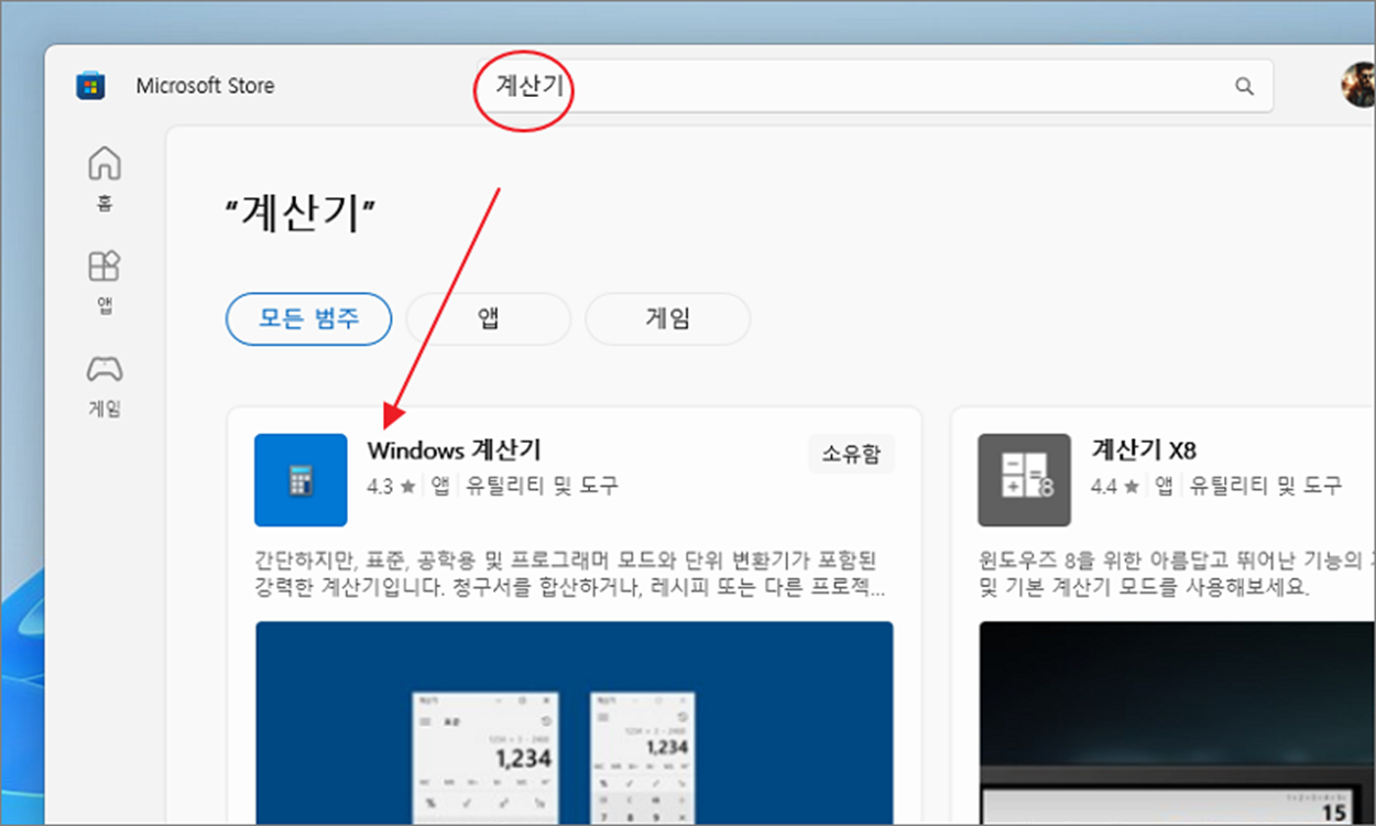 ▼ 윈도우에서 이전과 달리 볼 수 없는 계산기를 설치해 보겠습니다. 계산기 설치를 위해서는 마이크로소프트 스토어로 가야 합니다. 검색에서 마이크로소프트 앱을 찾아서 실행합니다.