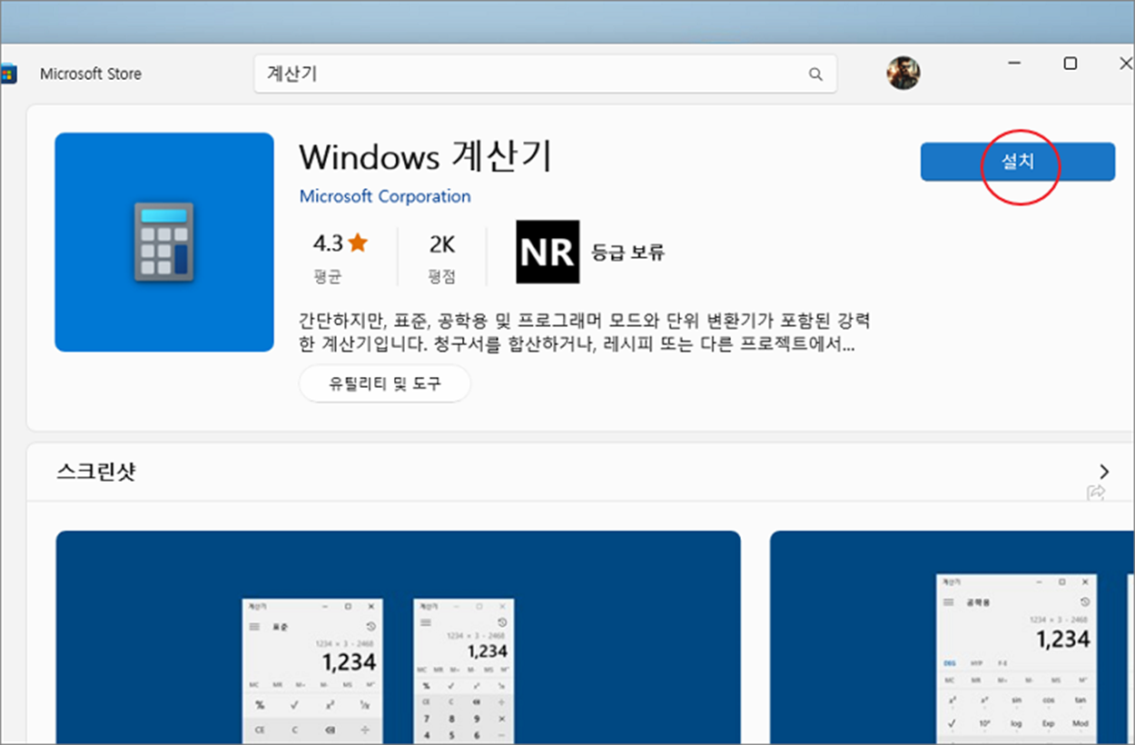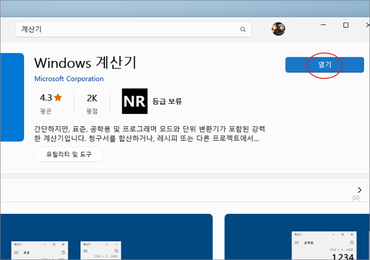 ▼ 스토어 앱의 상단 검색란에 "계산기" 라고 입력합니다. 계산기 검색 결과 제일 처음에 보이는 "Windows 계산기" 가 이전 윈도우10 에 설치되어 있던 것과 가장 유사해 보입니다.
