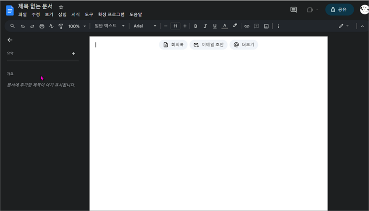 ▼ 구글 문서 도구는 기본적으로 하얀색 바탕입니다. 이것을 다크 모드로 변경해 보겠습니다.