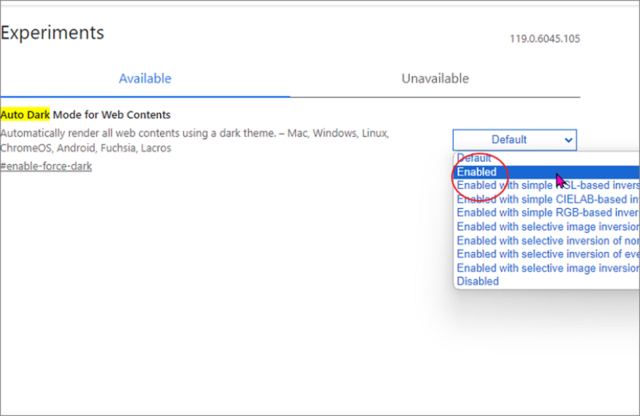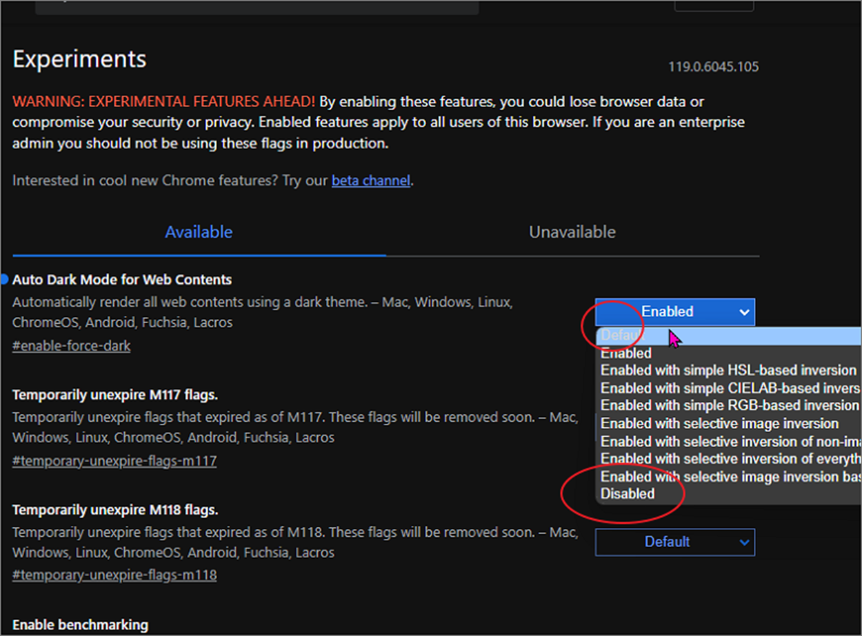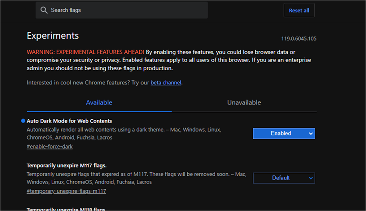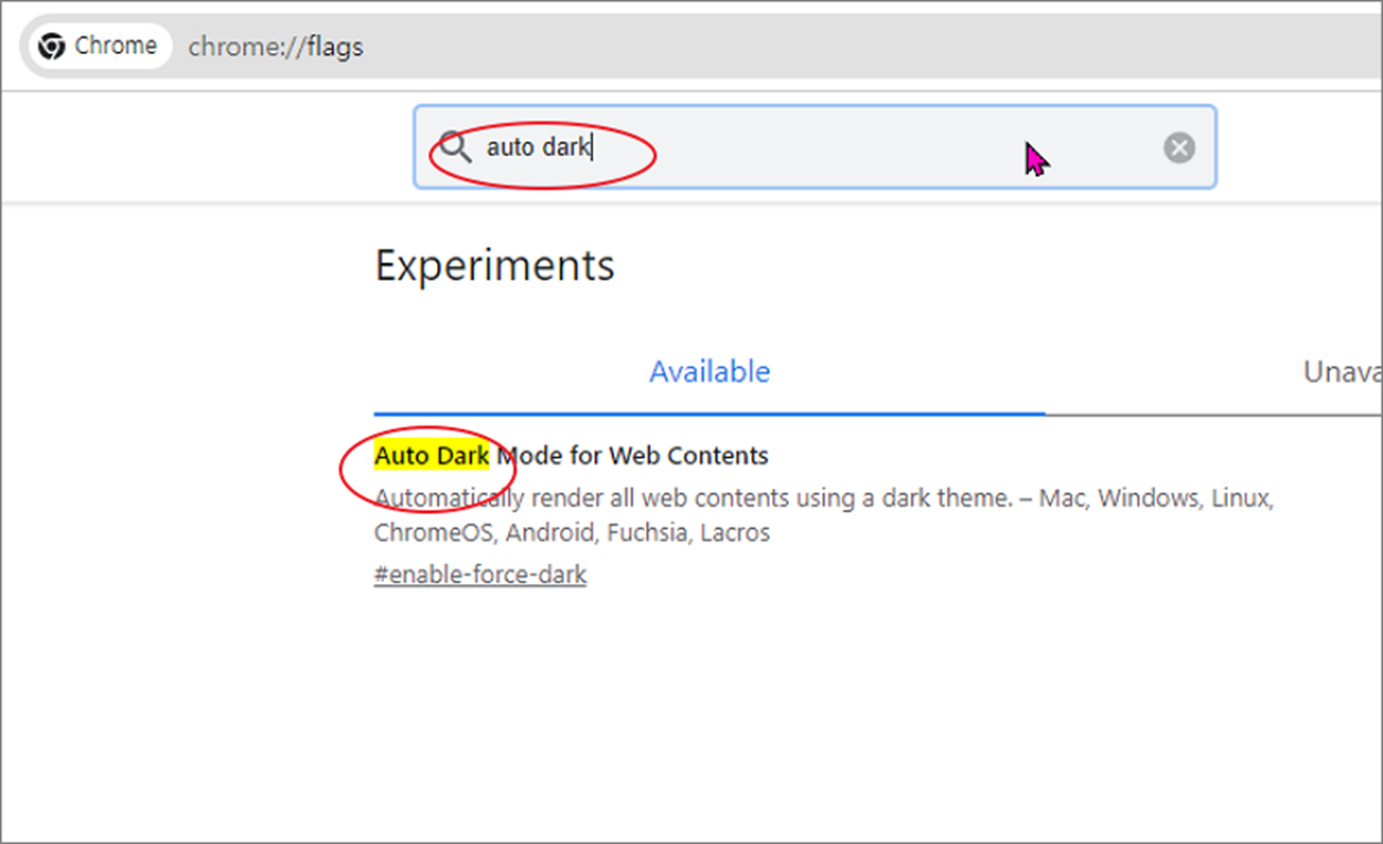 ▼ 구글 다크모드 적용을 위해서는 크롬을 사용해야 합니다. 크롬 브라우저에서 실험실 옵션이 있는 chrome://flasgs 페이지로 이동합니다. 그리고 상단 옵션 검색란에 ‘auto dark’ 라고 입력합니다. 검색 결과에서 Auto Dark mode for Web Contents 가 나타날 겁니다.