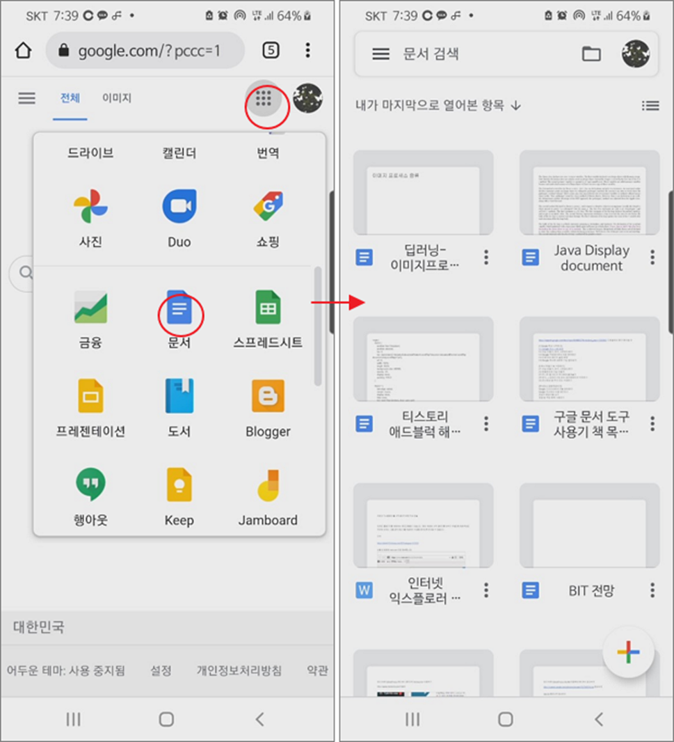 ▼ 다음은 스마트폰에서의 다크모드 설정 방법입니다. 스마트폰에서 크롬 브라우저를 실행하고 구글 문서 도구인 문서로 이동합니다.