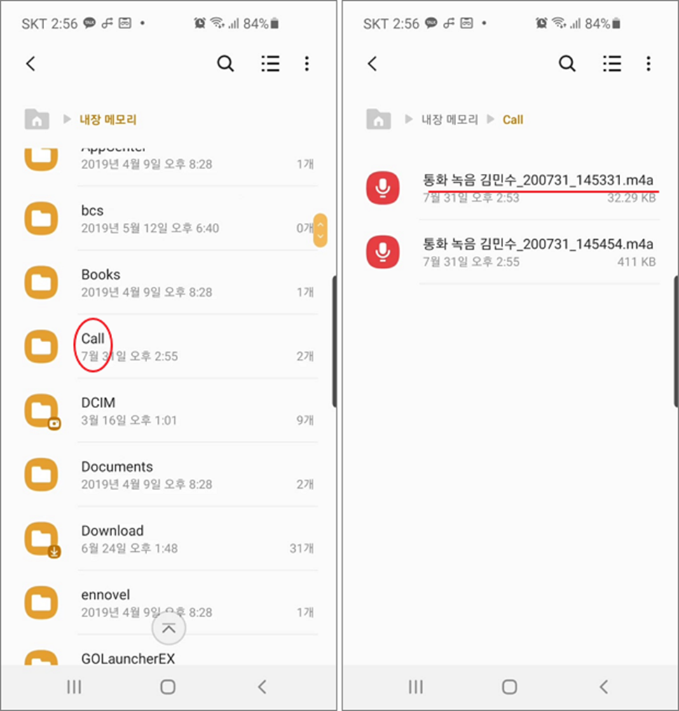 ▼ 통화 녹음 파일은 내장 메모리로 가서 Call 폴더로 이동하시면 이전까지 녹음한 음성 파일을 모두 볼 수 있습니다.