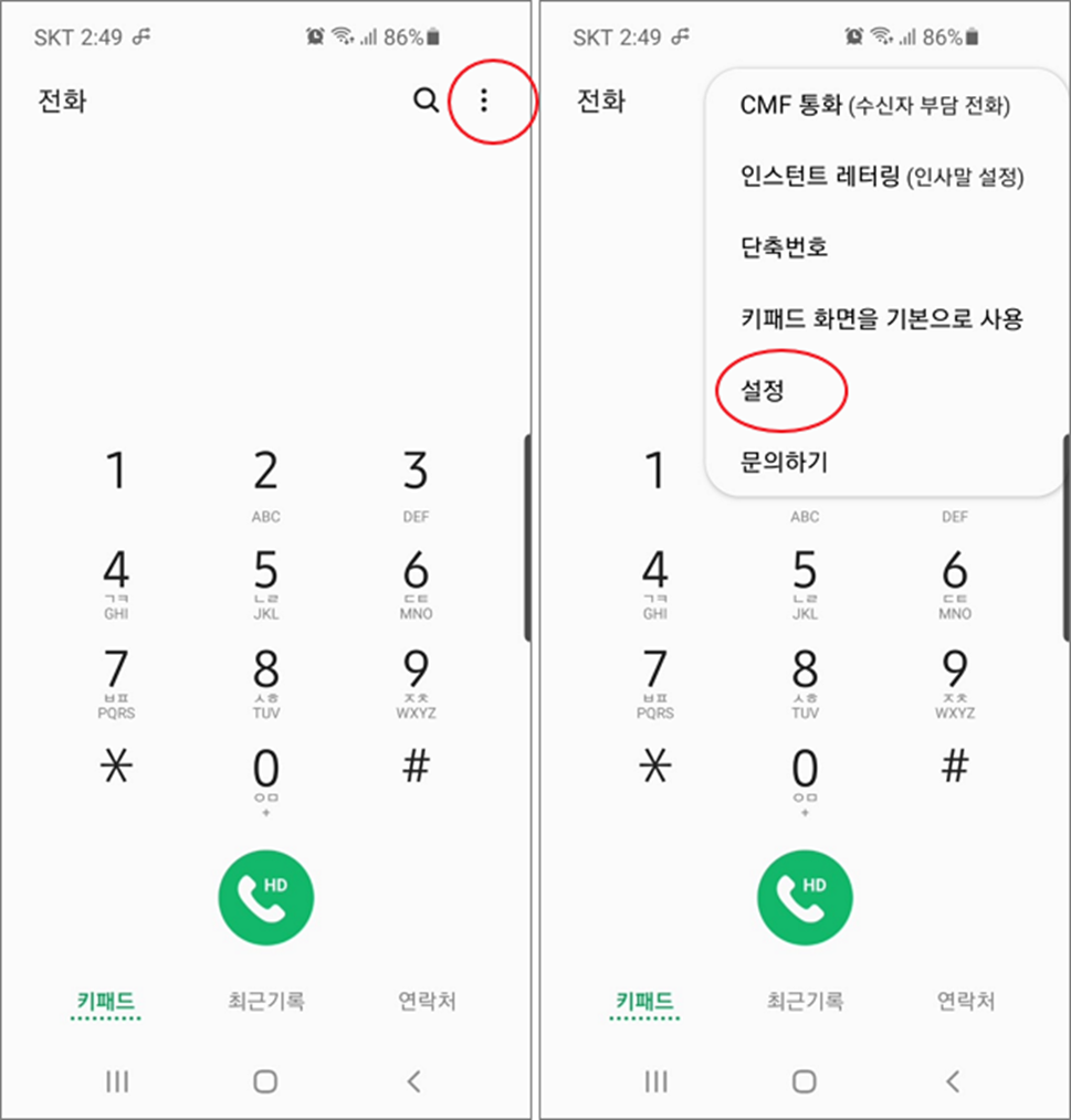 ▼ 자동 통화 녹음 기능을 사용하기 위해 설정을 변경해 보겠습니다. 통화 버튼을 누르고 하단 탭에서 “키패드” 나 “최근기록” 을 눌러 이동한 후 오른쪽 상단에 더보기 버튼을 클릭합니다. 하위 메뉴에서 “설정” 을 선택합니다.