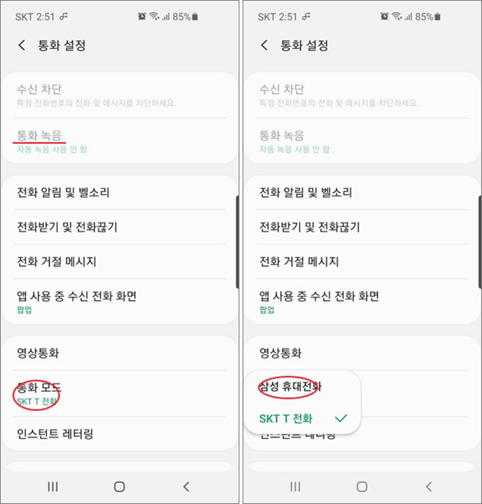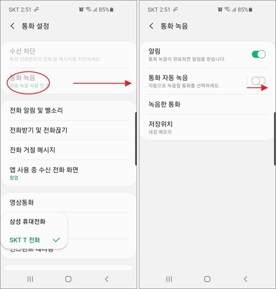 ▼ 삼성 휴대전화로 변경하면 그림처럼 비활성화되었던 통화 녹음 옵션이 활성화되었습니다. 해당 통화 녹음을 통화 자동 녹음 으로 변경합니다.