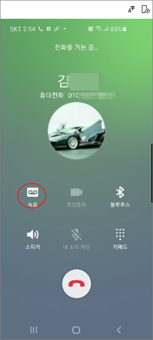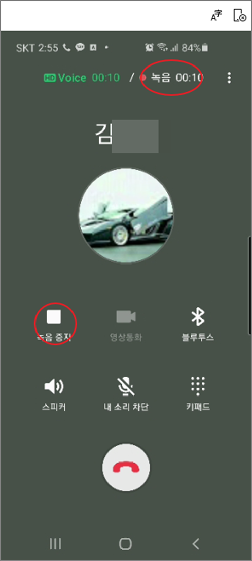 ▼ 통화 연결이 되는 순간 녹음은 자동으로 시작되고 화면에는 “녹음 중지” 버튼이 나타납니다.