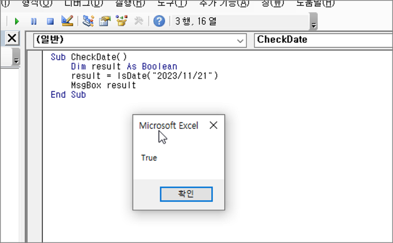 코드를 실행하면, “Date”는 현재 날짜를 반환하는 함수이므로 결과값으로 “True”가 출력됩니다.