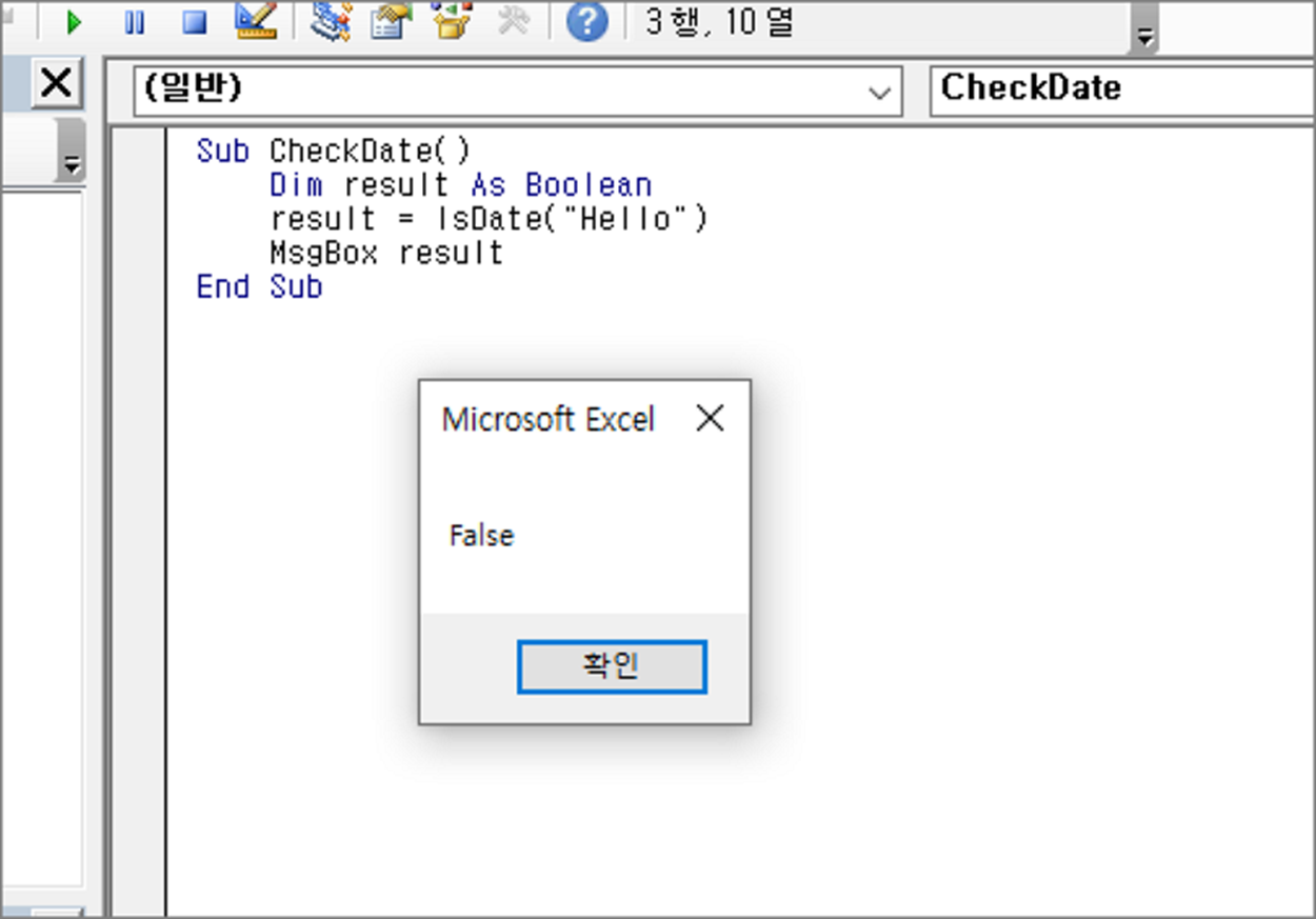 이 코드를 실행하면, "Hello"는 날짜로 인식될 수 없는 문자열이므로 결과값으로 “False” 를 출력합니다.