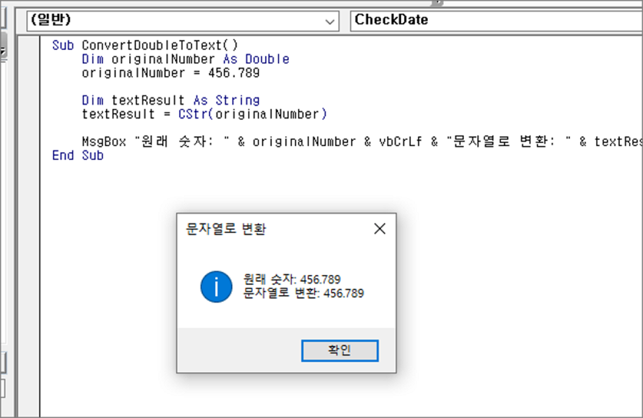 MsgBox "원래 숫자: " & originalNumber & vbCrLf & "문자열로 변환: " & textResult, vbInformation, "문자열로 변환"