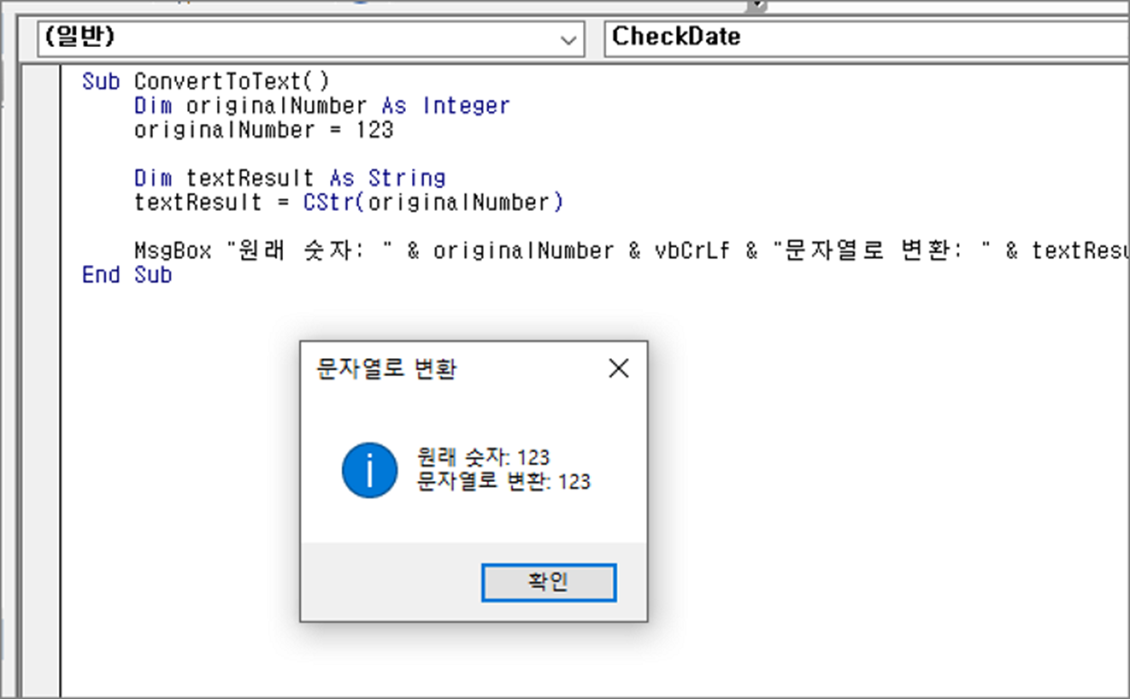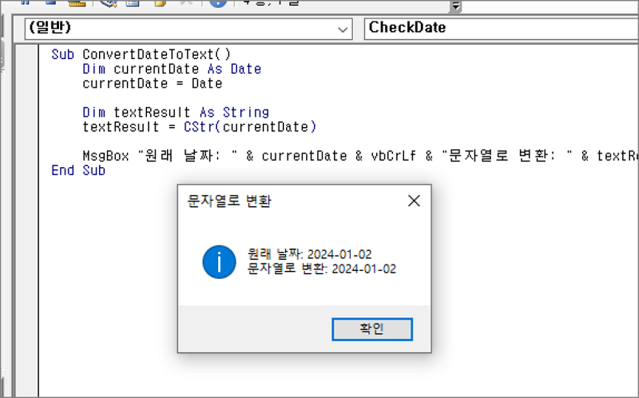 MsgBox "원래 날짜: " & currentDate & vbCrLf & "문자열로 변환: " & textResult, vbInformation, "문자열로 변환"
