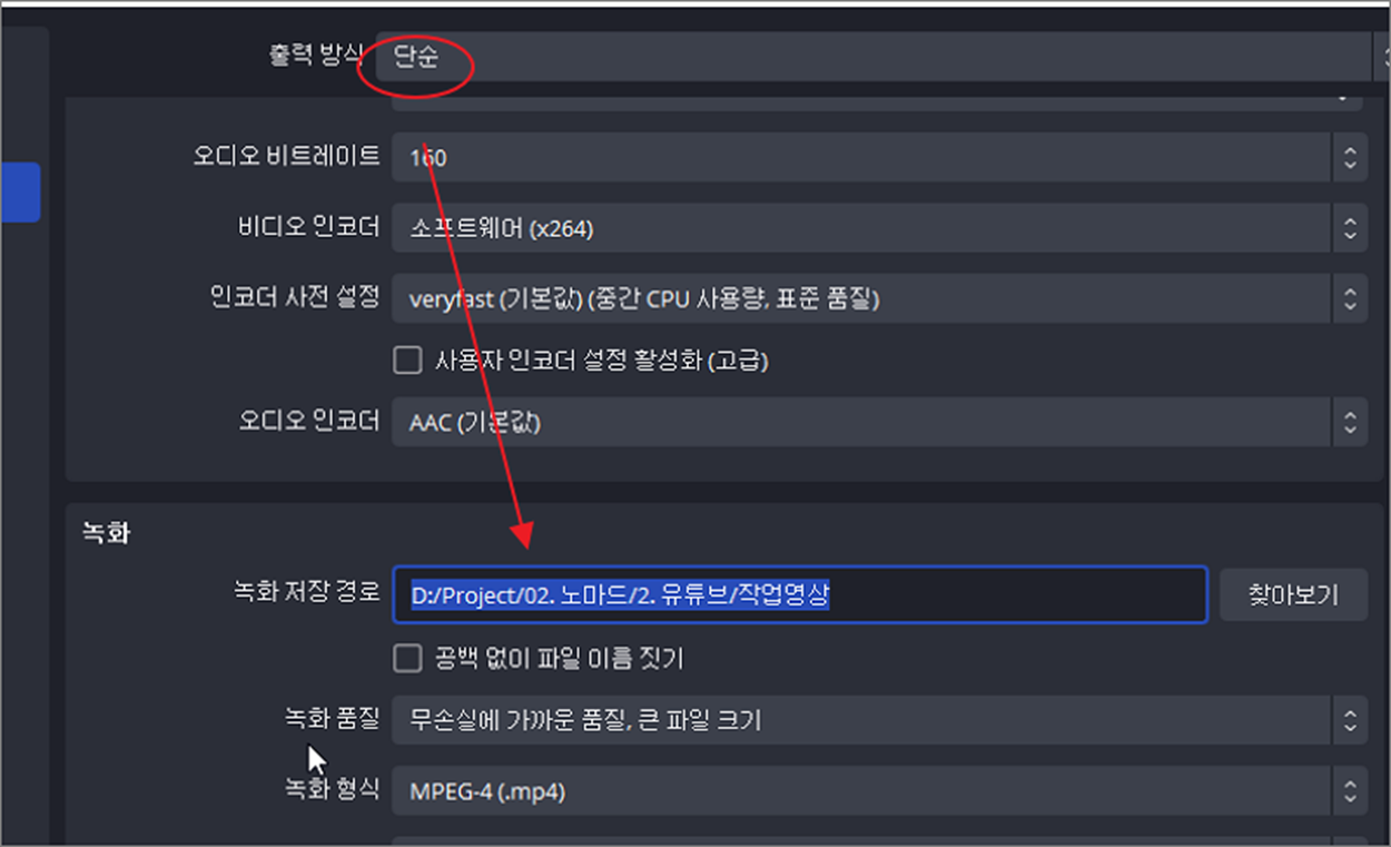 ▼ “단순” 으로 지정한 경우 아래 “녹화” 항목에서 “녹화 저장 경로”를 지정할 수 있습니다.