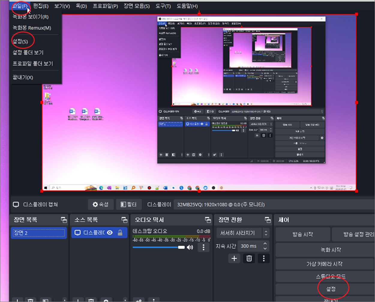 ▼ 녹화 파일 경로를 변경하기 위해서는 설정 페이지로 이동해야 합니다. 설정 페이지 이동 방법은 두 가지입니다. 상단 메뉴에서 파일 > 설정 메뉴를 클릭합니다. 또는 오른쪽 하단에 설정 버튼을 클릭하는 것입니다.