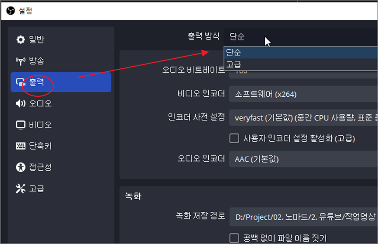 ▼ 설정에서 왼쪽 사이드에 “출력” 버튼을 클릭합니다. 출력 방식은 두 가지가 있습니다. 두 가지 모두 녹화 저장 경로를 따로 선택해야 합니다. 먼저 출력 방식에서 “단순” 을 알아보겠습니다.