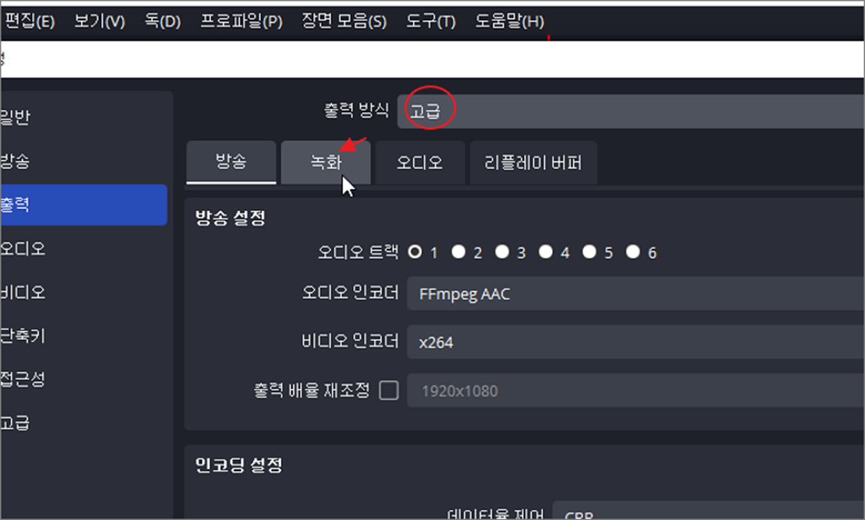 ▼ 다음은 “고급” 을 선택한 경우입니다. “녹화” 탭으로 이동합니다.