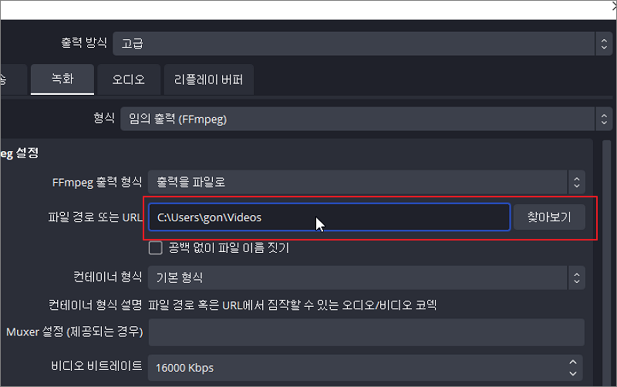 ▼ “녹화” 탭으로 이동하시면 “파일 경로 또는 URL” 항목에서 영상 저장 경로를 지정할 수 있습니다. 이상으로 출력방식에 따라 영상 저장 경로를 변경하는 방법에 대해 알아보았습니다.