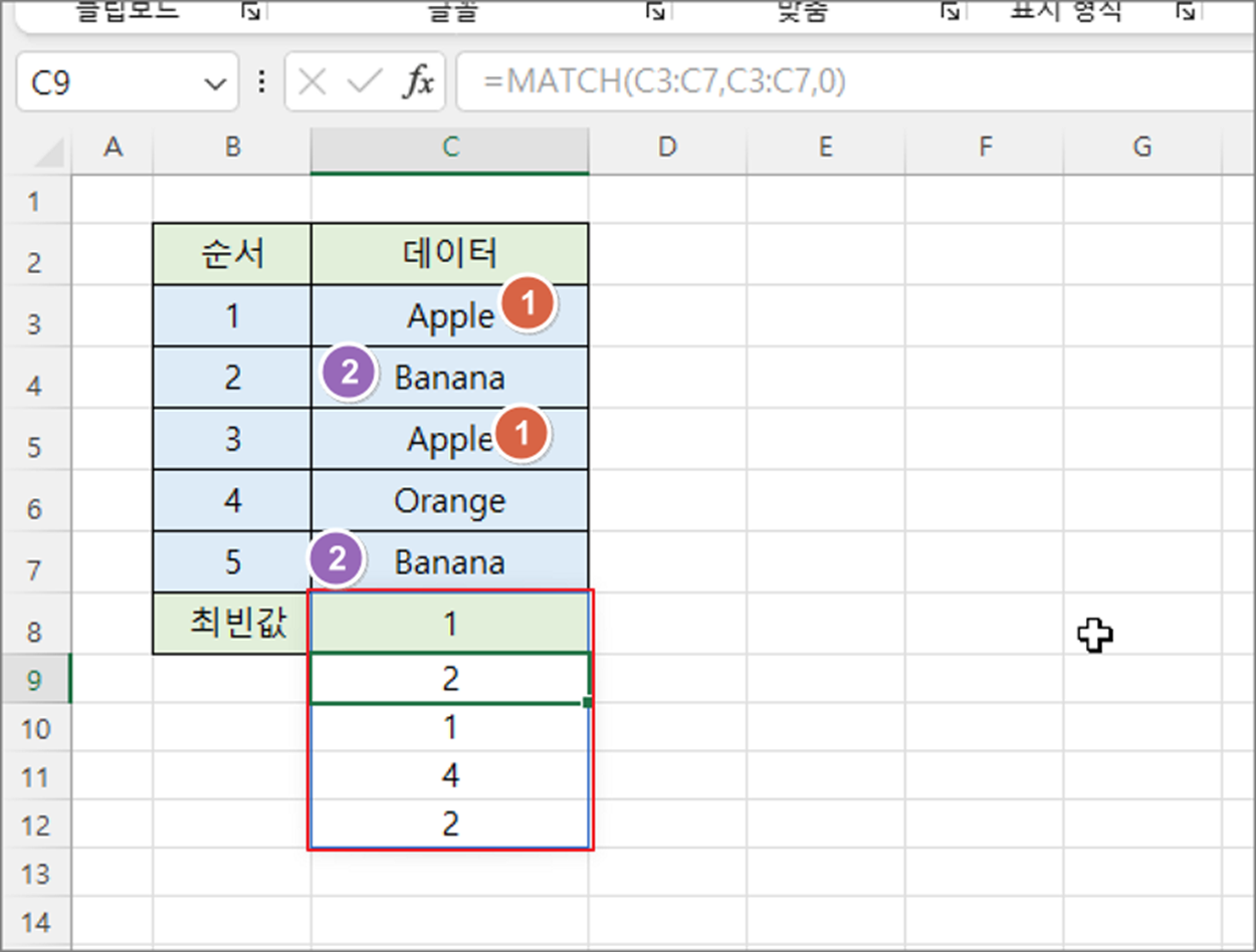 ▼ 수식은 엑셀에서 특정 범위 내에서 가장 많이 나타나는 값을 찾는 데 사용되는데 상세히 설명하겠습니다. MATCH(C3:C7,C3:C7,0) “MATCH” 함수는 특정 값을 검색하여 범위에서 그 위치를 반환합니다. 여기서 “C3:C7”는 검색 대상 범위입니다. 두 번째 “C3:C7”는 검색할 값을 나타냅니다. “0”은 완전히 일치하는 값을 찾도록 합니다. 이 결과는 배열 형태로 반환되는데 Apple 과 Banana 가 숫자 1과 2를 두 개씩 반환했습니다.