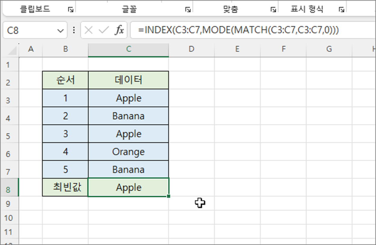 ▼ 전체 수식은 다음과 같습니다. 수식은 텍스트 데이터에서 가장 자주 나타나는 값을 찾습니다. MATCH 함수를 사용하여 각 항목의 위치를 찾고, 그 결과를 MODE 함수에 전달하여 가장 자주 등장하는 값을 찾습니다. 이러한 방식으로 텍스트 데이터에서 최빈값을 찾을 수 있습니다.
